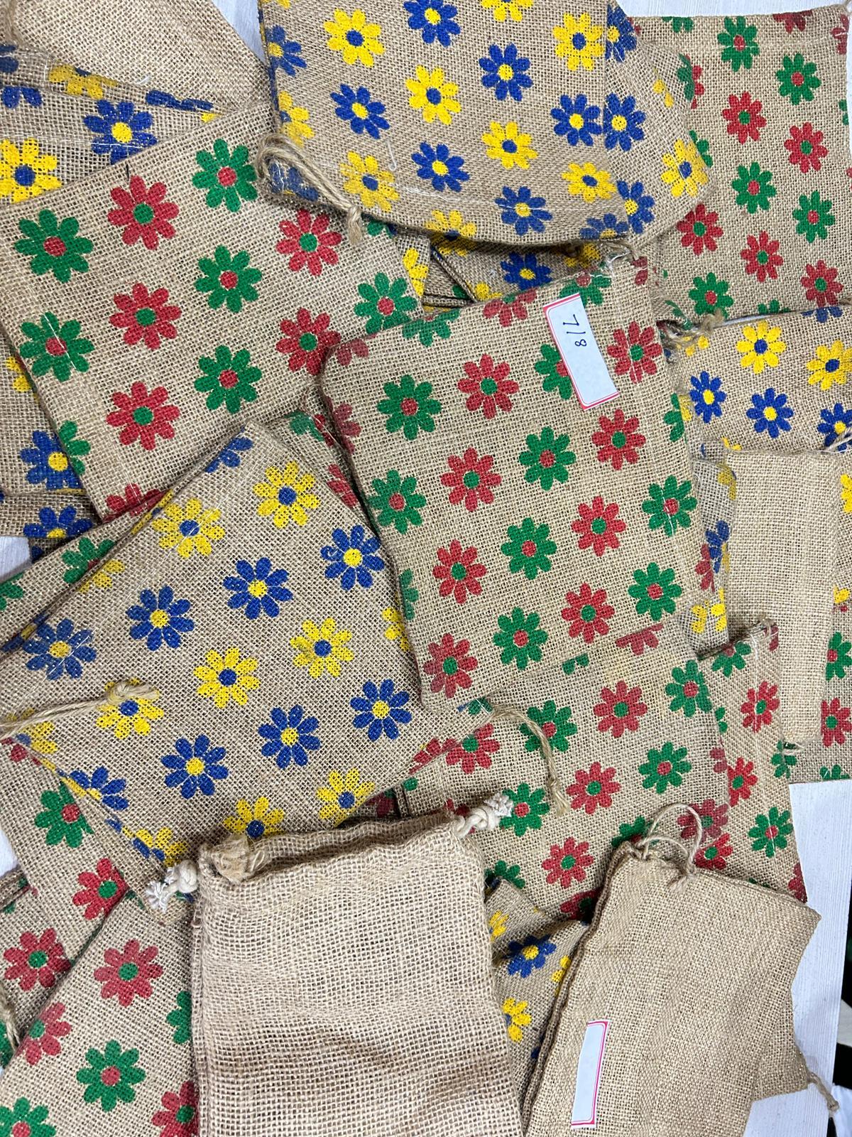 A stylish flower printed natural jute pouch is a type of eco-friendly shopping bag made from jute, a sustainable and biodegradable material. Here's a brief overview: